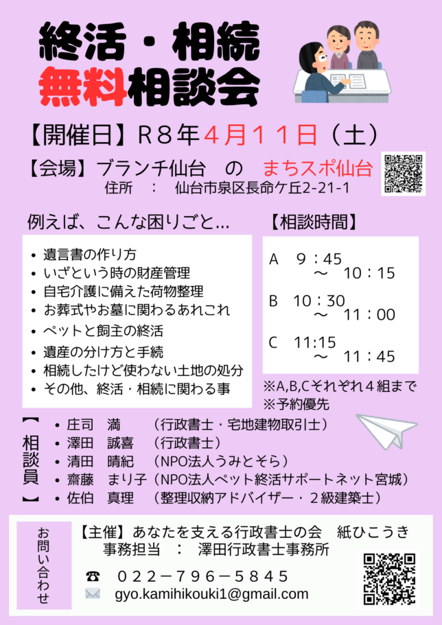30分という短い時間ですが、あらかじめメモを準備して来て下されば、あなたの疑問にお答えし、あなたが進めていくべき終活の見通しをお示しすることは出来ます!