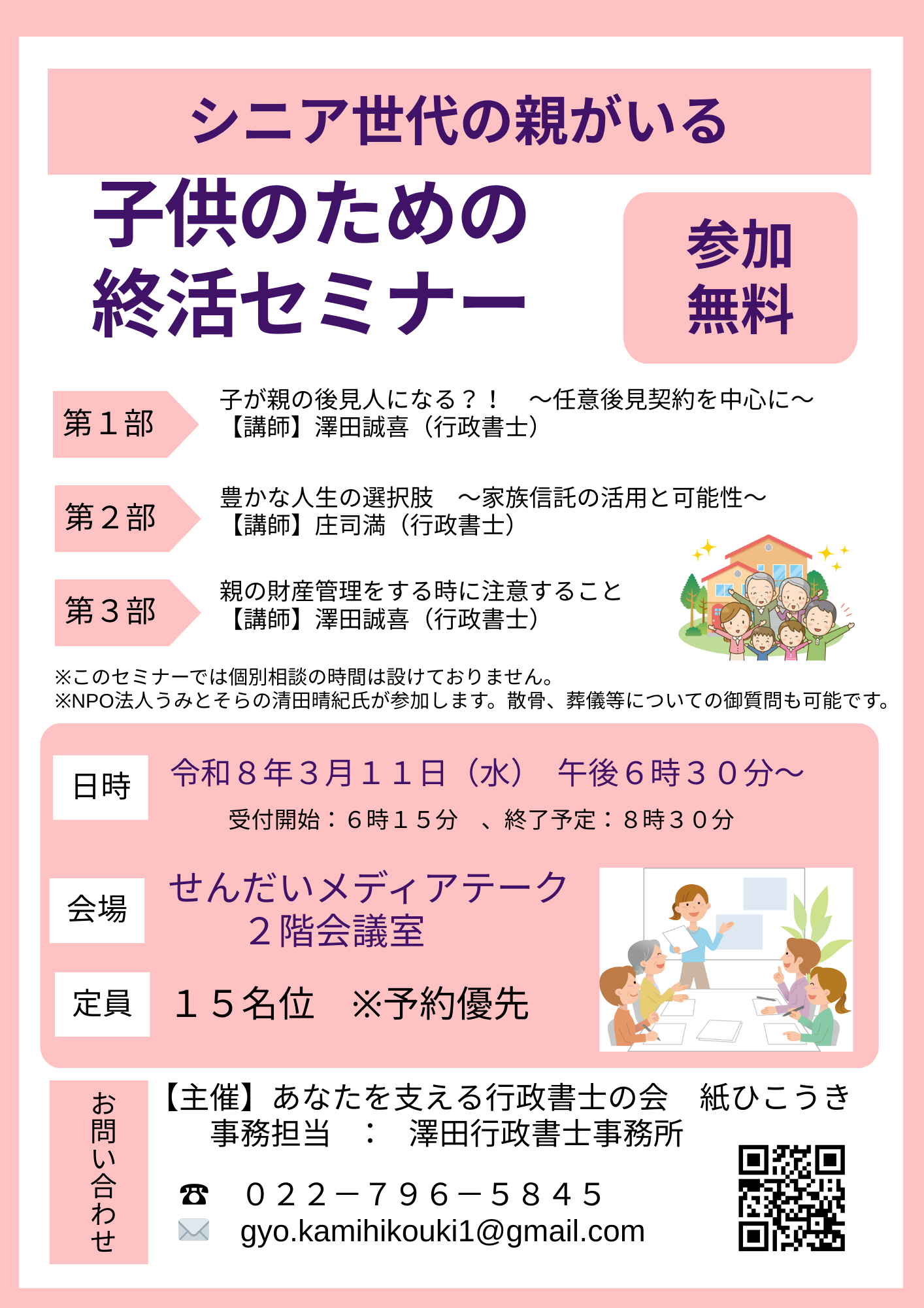 シニア世代の親を支える子供世代向けのセミナーと、相続や終活の無料相談会の御案内