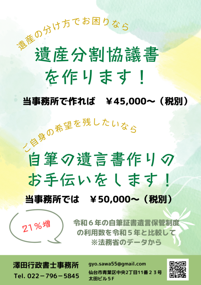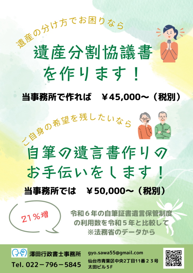 ※現在、料金体系を見直し中ですが、この遺産分割協議書と自筆証書遺言の基本手数料は令和8年も変更しない予定です。